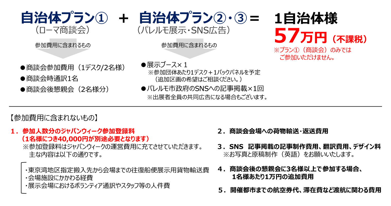 1団体570,000円の参加料には、以下の内容が含まれます:ローマ商談会とカクテルネットワーキング(2名分)ローマ商談会でのイタリア語通訳(1名)ジャパンウィーク自治体ブース出展現地SNS記事広告掲載(予定)